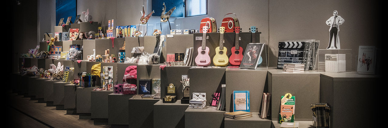 Tablettaskar med piller mot tunghäfta, speldosor av alla de slag och en hel värld av fingerdockor – det och mycket mer hittar du i Scenkonstmuseets museibutik. Botanisera bland musikinstrument, handdockor, teatersmink, masker, inredningsattiraljer och smycken tillverkade av delar från gamla instrument. Med ett brett sortiment utifrån konstarterna teater, musik och dans finns här något för både stor och liten.