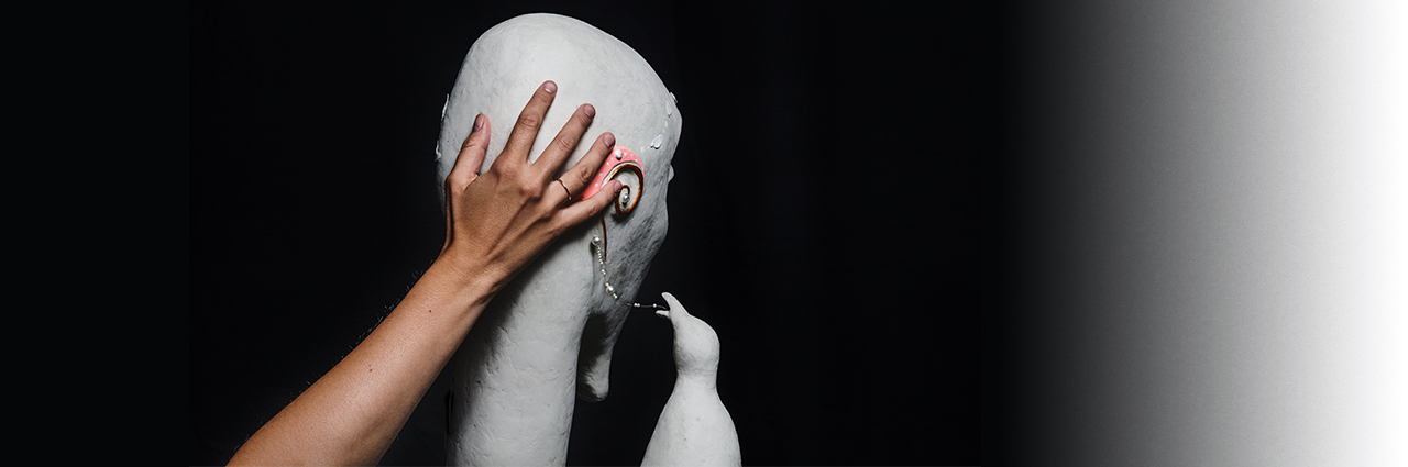 (Syntolkning av bilden: En huvudskulptur i lera ses bakifrån med skymtande profil. Dess snäckformade öra länkas samman med en fågel som ses kvittra mot huvudet. En verklig hand vilar stillsamt mot bakhuvudet.)